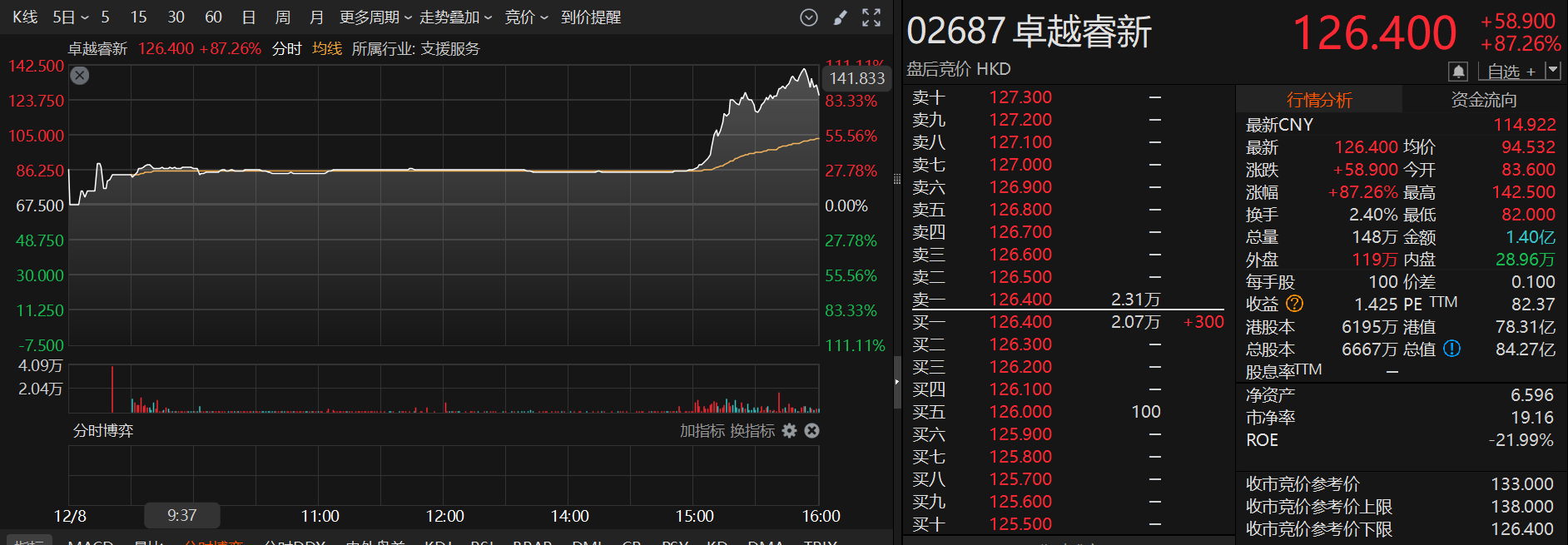 (港股卓越睿新上市首日开盘价83.60港元/股,盘中最高达142.50港元/股,收盘报126.40港元/股,涨幅87.26%。)